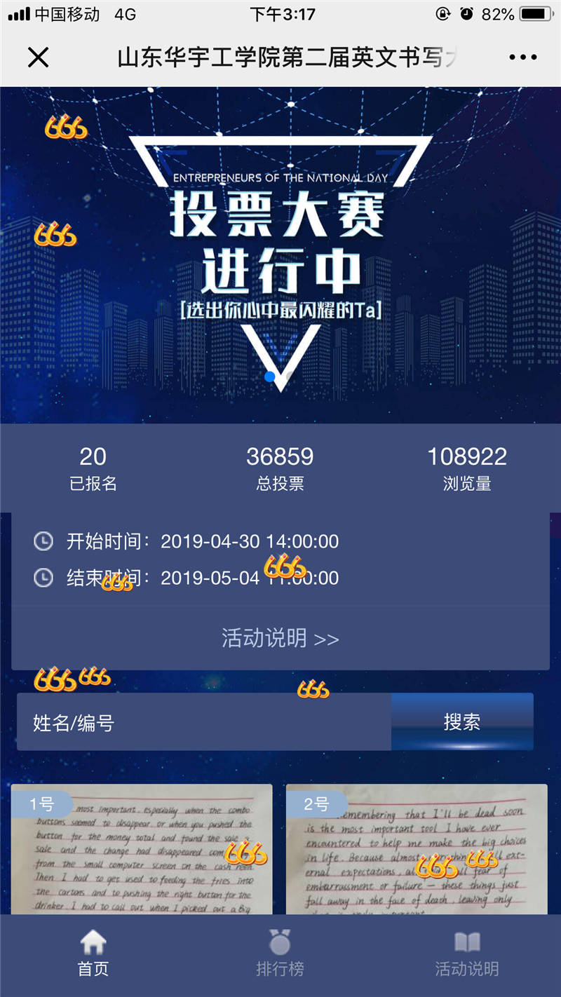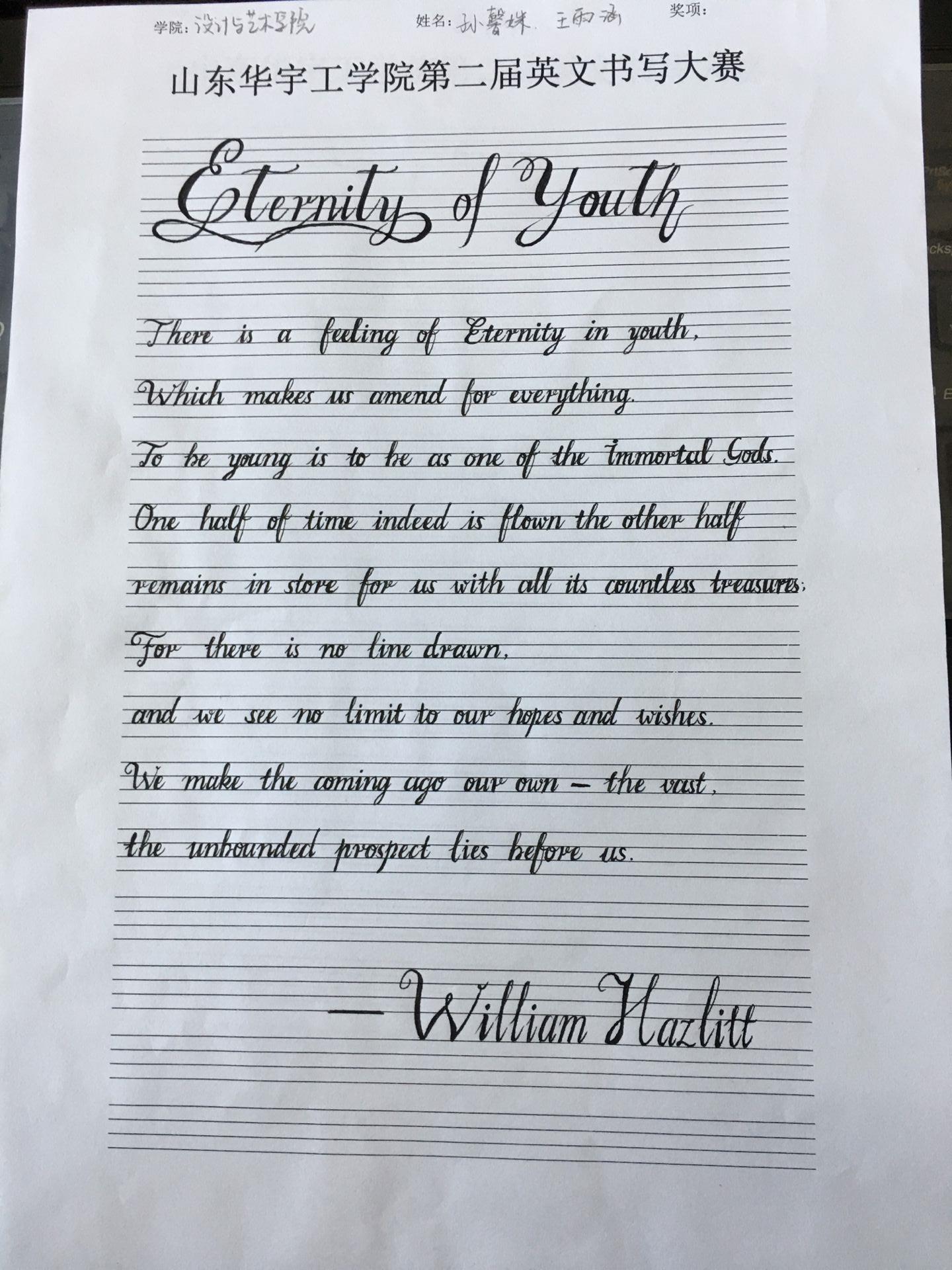 在这个展示自我的舞台,选手们将用自身的书写水准为自己的梦想代言;同学们在写作品的同时不仅可以领略书法的风采,也能感受到学习英语的乐趣。经过激烈角逐,评委根据选手们的现场表现给予公正准确地评分,然后按照分数高低筛选出相对优秀的选手进入决赛。王雨涵,孙馨姝,焦燕帅,王辰曦,李佳盈,刘岩获得一等奖;石鑫捷,赵佳慧,谢秀鑫,何鹏,王殿盛,黄宝萍获得二等奖;巩文惠,解国庆,朱亿豪,张苗,朱成震,焦宇,马西西,赵云静获得三等奖。