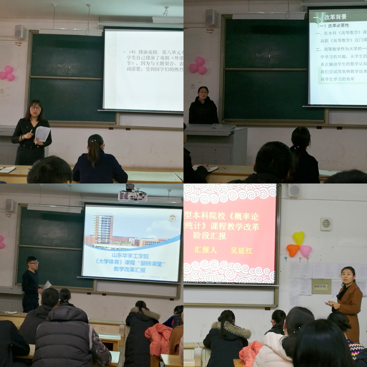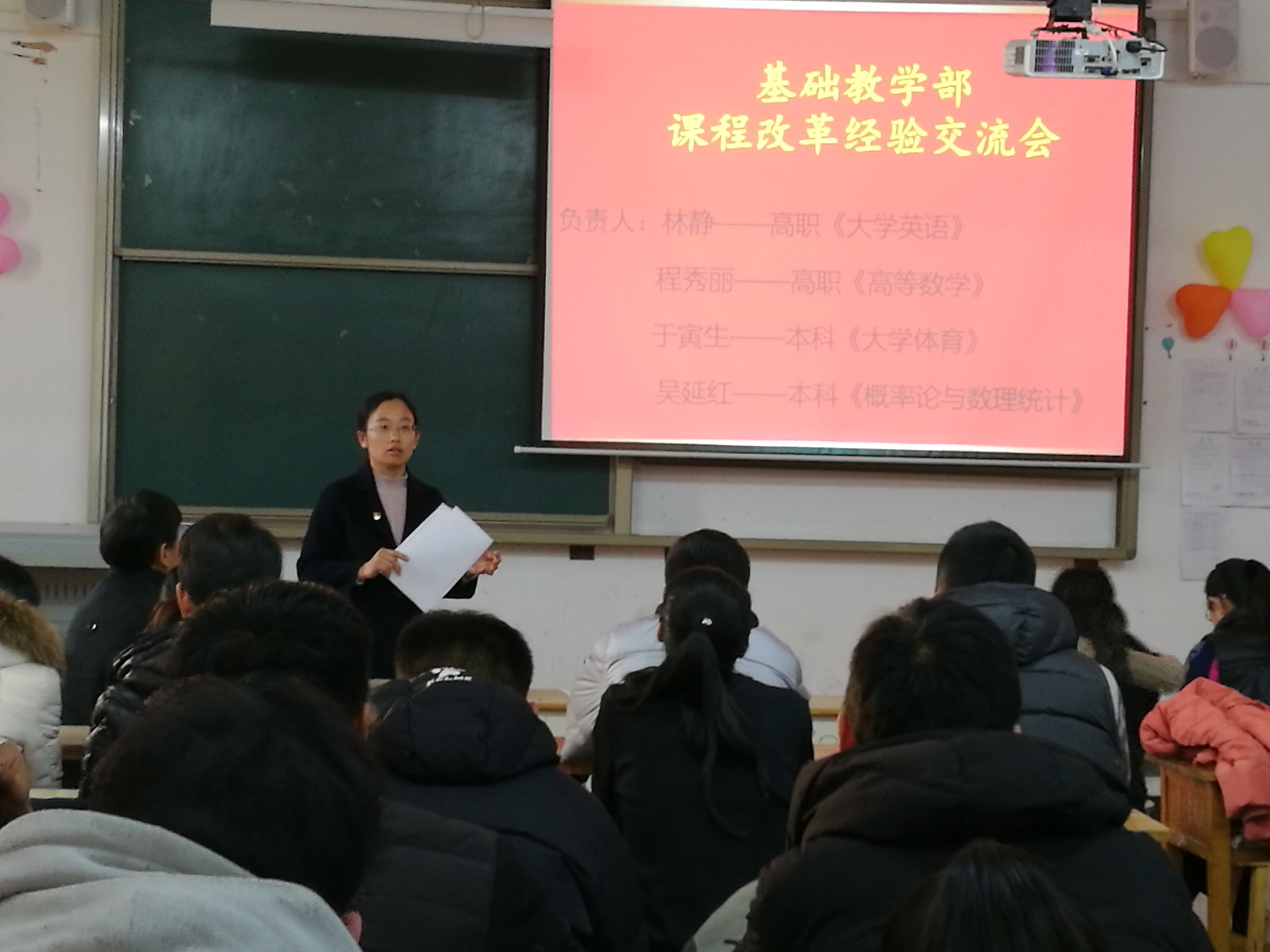 此次大会分为:课程改革经验交流、表彰先进、工作总结三个部分。课程改革经验交流主要为高职《大学英语》、高职《高等数学》、本科《大学体育》和本科《概率论与数理统计》四门课改课程的阶段性成果汇报。林静老师、程秀丽老师、于寅生老师、吴延红老师分别对所负责课改课程进行了总结,四位老师带领其教学改革团队,按照beat365官网推行课改课程的要求,积极进行课程模式和教学方法的改革。表彰先进主要对在本年度2017年基础教学部优秀教案、2017年基础教学部讲课比赛、2017年基础教学部说课比赛中取得优秀成绩的个人进行表彰。基础教学部副主任李琦、基础教学部副主任刘兖峰,以及英语、数学、体育、物理教研室主任共同为获奖的18名教师颁奖并合影留念。在场老师为获奖教师鼓掌祝贺,纷纷表示要向先进教师学习,鼓足干劲,奋起直追,不断提升教育教学能力。