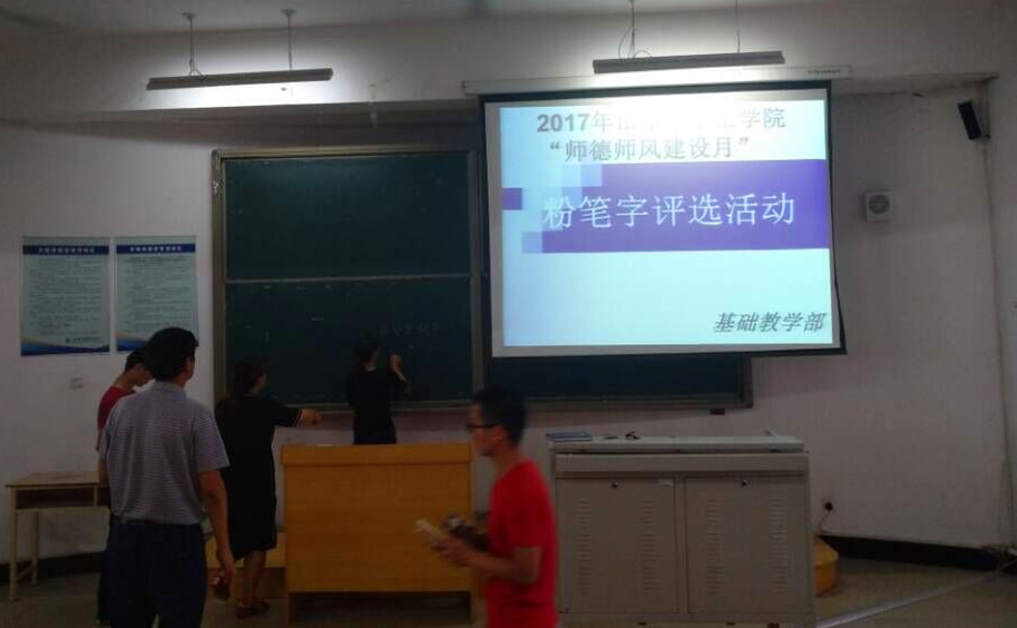 粉笔字是教师的基本功之一。教师粉笔字的书写水平不仅直接关乎教师的自身形象和课堂教学效果,而且对于学生练一手好字起到至关重要的示范引领作用。为了做好学生的榜样,培养学生优良的书写能力, 基础教学部于2017年9月21日下午四点在10号楼F201举办了教师粉笔字评选活动。本活动邀请了大学体育部主任刘兖峰作为比赛评委。