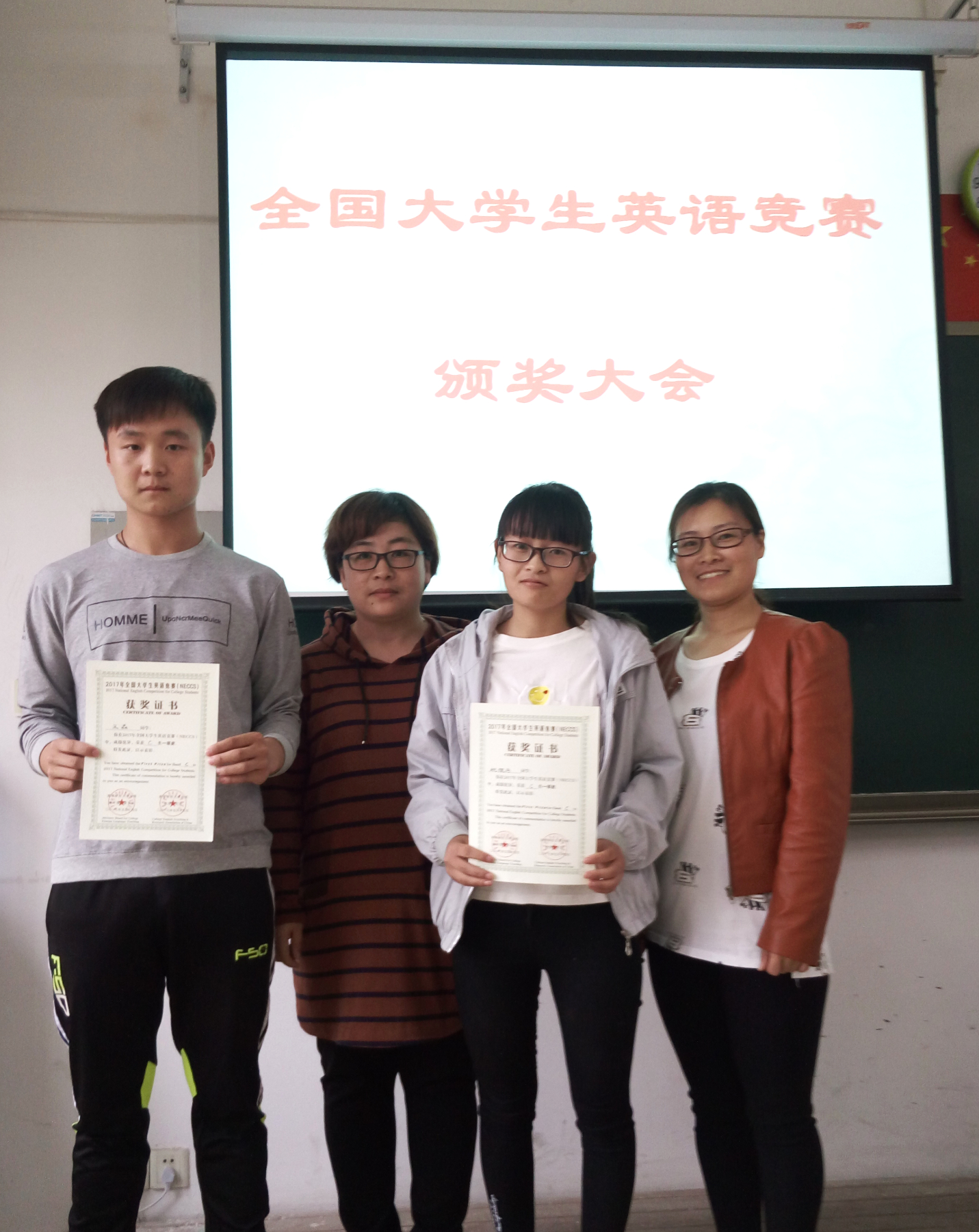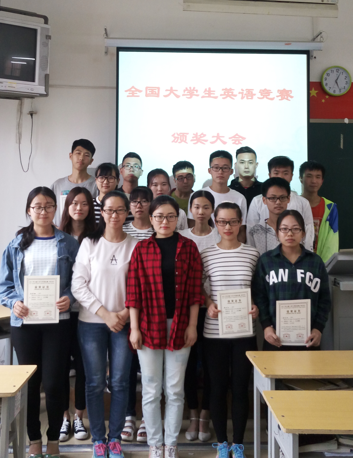 2017年全国大学生英语竞赛(初赛、决赛)在学校领导的高度重视下,在英语教研室所有教师的努力辅导、配合和全院学生的积极参与下,已圆满的落下帷幕。国家一等奖2人,分别为经济管理学院16级本科物流二班姚银丽、机械工程学院16级本科机械电子工程一班王磊;国家二等奖12人,国家三等奖21人。