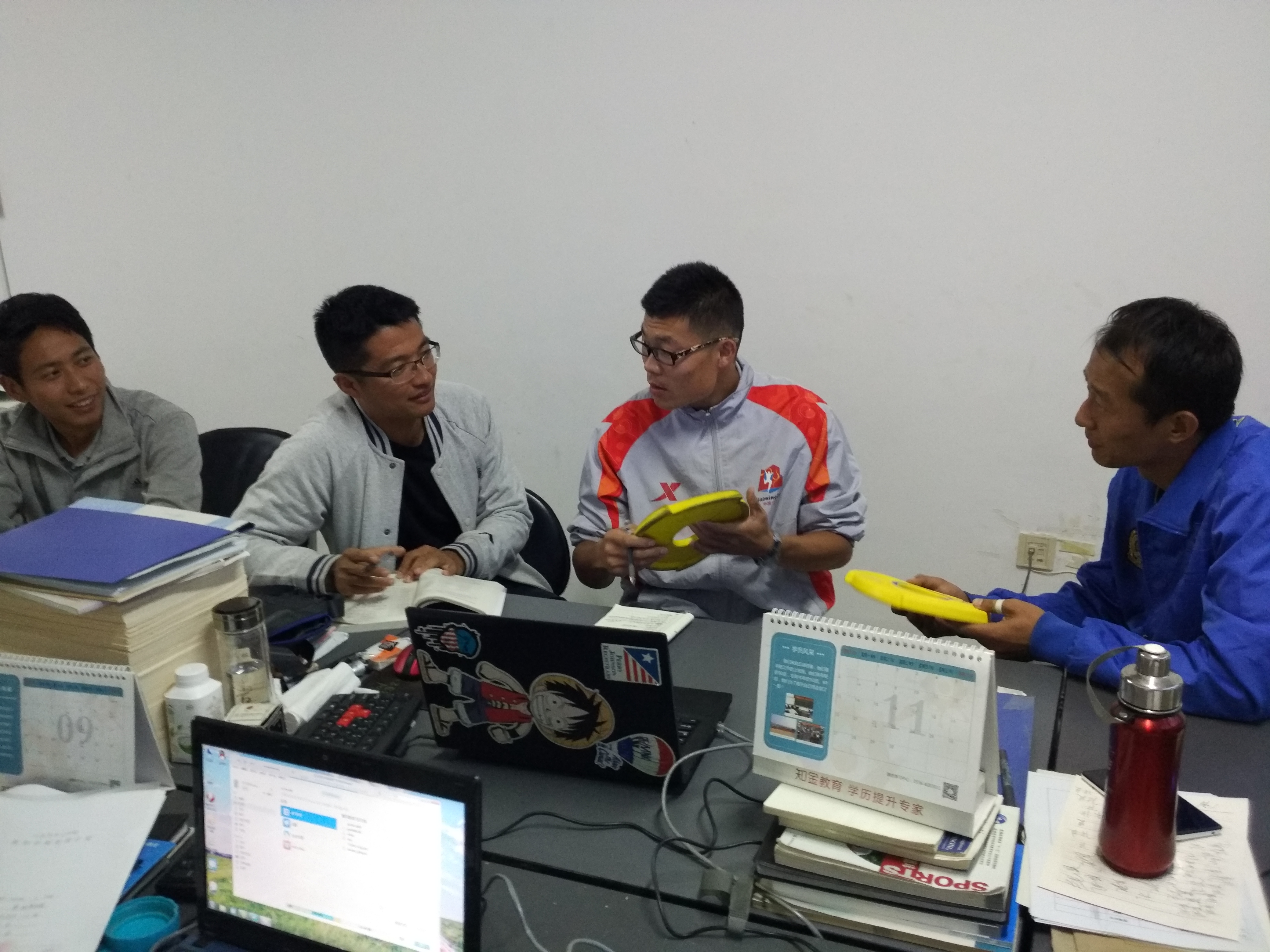 张昊老师首先强调此次备课的重要意义:尝试飞盘教学是教学改革的重要一步;飞盘价格便宜,趣味性强,长期从事飞盘运动能够有效发展学生力量、速度、灵敏等身体素质,还可以培养学生合作意识和相互配合的能力等。其次各体育教师针对接飞盘的技术和抛掷飞盘、课堂教学组织方法、飞盘游戏规则等展开集体学习,相互交流与探讨课程开设的可行性与适应性;最后,全体体育教师就课程开设的场地、器材、每节课的内容设置、时间安排、安全问题等展开交流与讨论。会议气氛活跃,各体育教师积极发言并认真做好学习笔记。