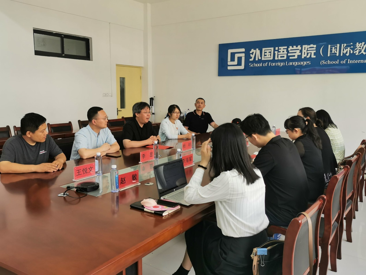 进一步深化大学英语教学改革,满足学生个性化需求,提高大学英语教学质量,基础教学部主任助理闫佩玉外语教研室主任刘伟伟、语言实验中心主任李海军及各课程组长一行六人6月9日赴齐鲁工业大学外国语学院(国际教育学院)开展大学英语教学改革调研学习。齐鲁工业大学外国语学院(国际教育学院)副院长杨明,公共外语教学部主任李显、语言综合实验教学中心副主任李灿灿、测试与题库建设中心副主任王悦文在文科楼213会议室与beat365官网教师进行了座谈交流。