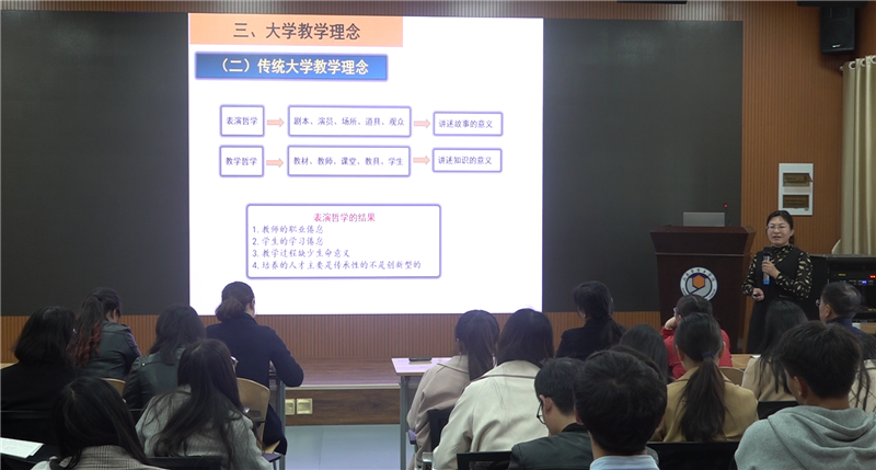 校长助理贺红岩首先结合自己阅读别敦荣教授的《大学教学原理与方法》的心得,告诉大家要想成为一名优秀的大学教师,必定要在现代大学教学理论指导下、教学理念的引领下创造性地开展教育教学工作。随后,她把大学课堂教学中教师需要的教学理论、教学理念以及常用的教学方法等串成一条主线,通过传统教学观和现代教学观的对比以及大学教学的新旧范式比较,深入浅出地讲解了大学教学的五大核心要素、现代大学教学理论、现代大学教学理念、现代大学教学方法五部分内容。她强调,现代大学的课程改革必将是一场教与学的革命,而这一切一定要以学生为中心,教师就要了解学生、亲近学生、想学生之所想、言学生之所谈,从学生的需要、兴趣、经验和活动出发,组织其活动,给予其指引,以学习为基本逻辑展开教学,培养学生学会学习,学生积极参与学习过程,促使学生主动学习、亲身实践、全面发展。